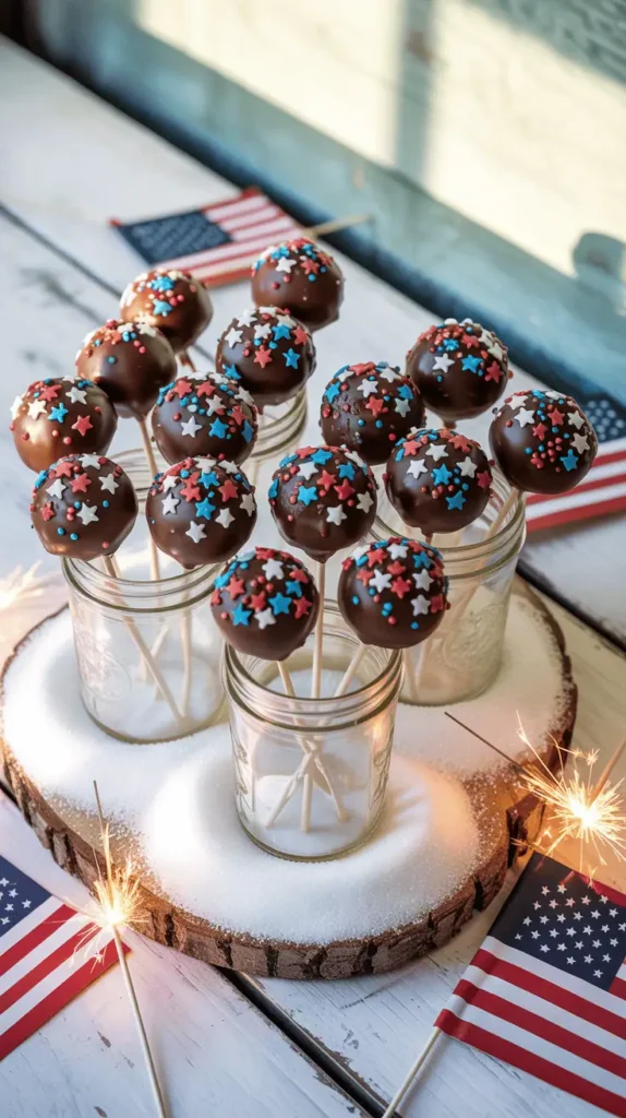 - 🎆 Firecracker Pops: Decorate with red, white & blue sprinkles and stand them in mini mason jars for Independence Day.